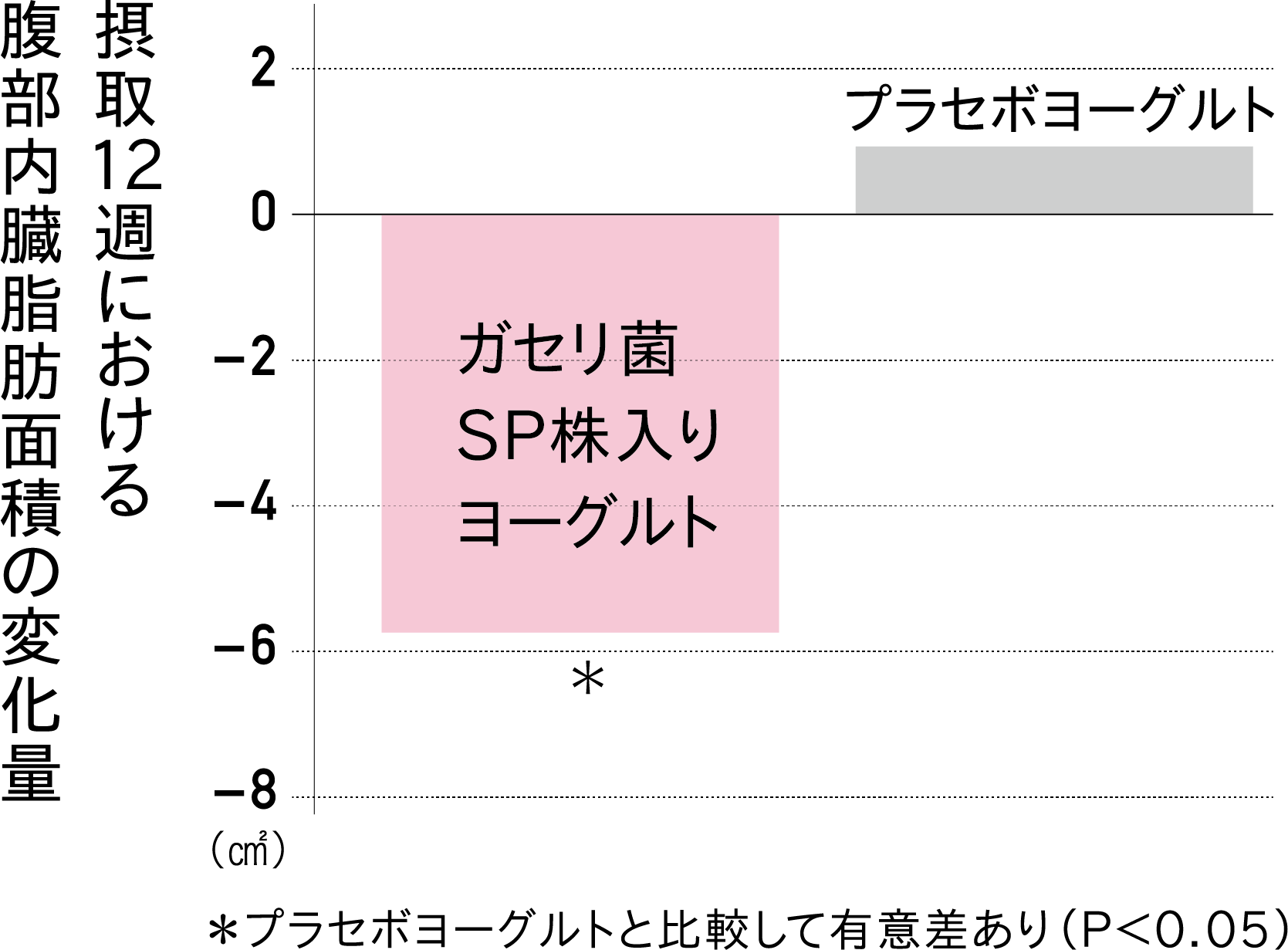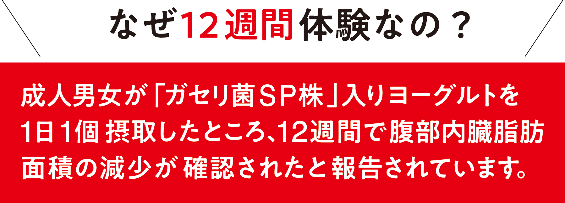 肥満傾向(BMI値: 25kg/㎡以上30kg/㎡未満、内臓脂肪面積: 80㎠以上)の20歳以上65歳未満の成人被験者101名( 「ガセリ菌SP株」入りヨーグルト群: 52名、プラセボヨーグルト群: 49名)を対象に二重盲検並行群間比較試験を実施した。被験者は、 「ガセリ菌SP株」入りヨーグルト1OOg( 「ガセリ菌 SP株」10億個)を摂取した群(男性: 27名、女性: 25名)、および 「ガセリ菌SP株」を含まないプラセボヨーグルト100gを摂取した群(男性: 27名、女性: 22名)の2群に分け、それぞれのヨーグルトを1日1個、12週間毎日摂取した。※プラセボヨーグルトは、 「ガセリ菌SP株」を含まないヨーグルトです。