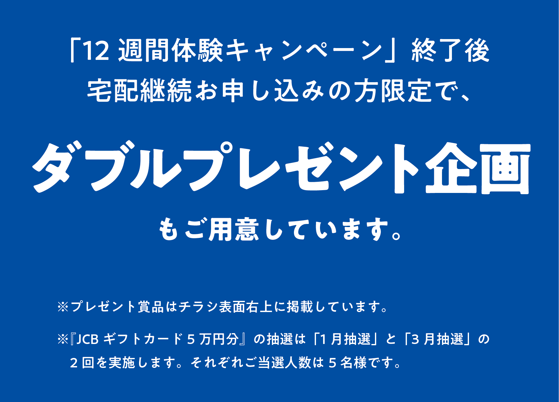 12週間後、宅配ご継続についてお伺いします。なおご継続いただいたお客様にはダブルプレゼント企画もご用意しています。